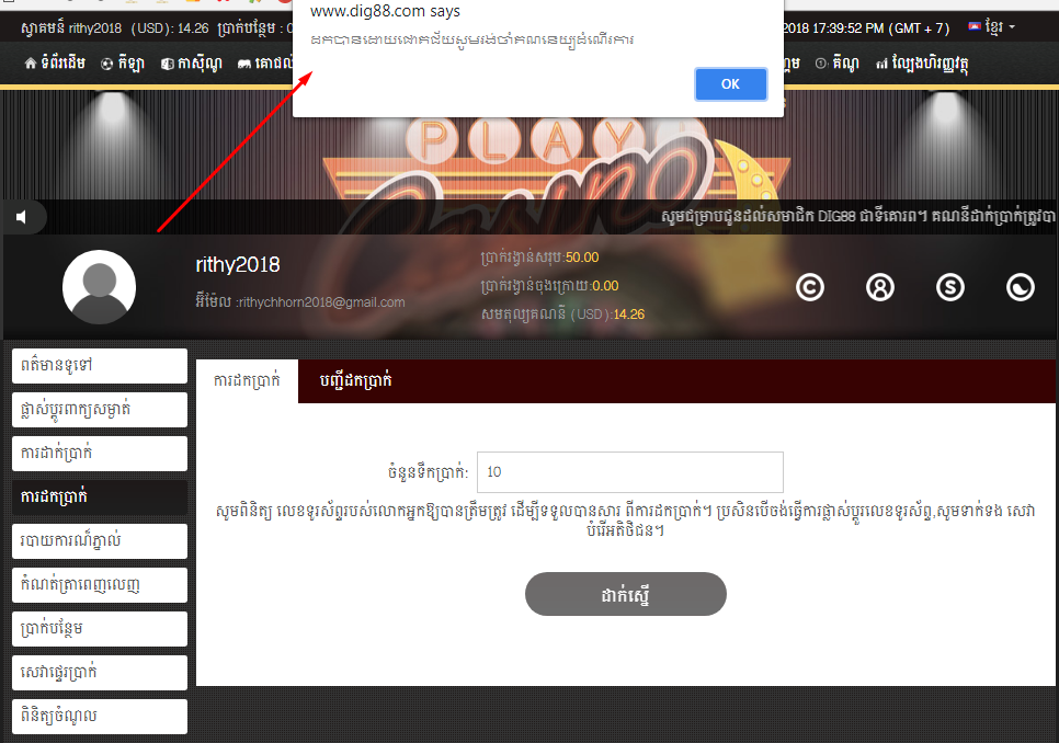 សូមលោកអ្នកធ្វើការរង់ចាំបន្តិច ដើម្បីអោយខាងក្រុមការងាររបស់ DIG88 ធ្វើការពិនិត្យជូន បើត្រឹមត្រូវ DIG88 នឹងដកទឹកប្រាក់ជូនដល់លោកអ្នកភ្លាមៗ តាមចំនួនការដាក់ស្នើរបស់អ្នក។